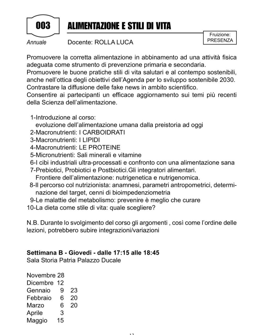 Ritorna per l'anno accademico 2024-25 il corso su Alimentazione e Stili di vita per Unitre a Genova presso la Sala Storia Patria di